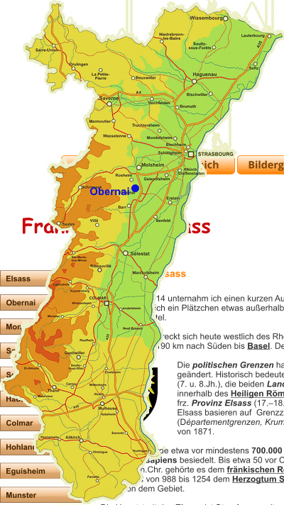 Im Frühjahr 2014 unternahm ich einen kurzen Ausflug nach Frankreich. Da ich nicht direkt nach Straßburgwollte, suchte ich ein Plätzchen etwas außerhalb. Im Elsass fand sich das kleine Städtchen Obernai und ein geeignetes Hotel.Das Elsass erstreckt sich heute westlich des Rheins von Wissembourg etwa auf der Breite von Karlsruheim Norden ca. 190 km nach Süden bis Basel. Der Hauptkamm der Vogesen bildet die Westgrenze.Die politischen Grenzen haben sich im Lauf seiner Geschichte mehrfach geändert. Historisch bedeutend sind hier vor allem das Herzogtum Elsass(7. u. 8.Jh.), die beiden Landgrafschaften des Elsass (12.–17.Jh.) innerhalb des Heiligen Römischen Reiches Deutscher Nation sowie die frz. Provinz Elsass (17.–18.Jh.). Die gegenwärtigen Grenzen der Region Elsass basieren auf Grenzziehungen der französischen Revolutionszeit(Départementgrenzen, Krummes Elsass) und des Frankfurter Friedensvon 1871.Das Elsass wurde etwa vor mindestens 700.000 Jahren erstmals von Menschen, und vor ca. 50.000 Jahrenvom Homo sapiens besiedelt. Bis etwa 50 vor Chr. lebten die Kelten in dieser Region, dann die Römer. Ab dem 5.Jh. n.Chr. gehörte es dem fränkischen Reich an, dann dem heiligen römischen Reich deutscher Nation und von 988 bis 1254 dem Herzogtum Schwaben. Im 17.Jh. übernahm dann Frankreich mehr und mehr von dem Gebiet.Die Hauptstadt des Elsass ist Strasbourg mit ca. 272.000 Einwohnern. Hier ist auch der Sitz des Europa-Parlaments.Das kleine Städtchen Obernai oder Oberehnheim mit seinen etwa 11.300 Einwohnern liegt etwas südlich von Straßburg. Im Jahr 778 wurde der Ort erstmals als Ehinheim erwähnt, seit ca. 1693 ist der Name Obernaigebräuchlich. Im 7.Jh. soll hier die hl. Odilie geboren worden sein. Viele spätmittelalterliche und Renaissance-Fachwerkhäuser prägen die Stadt, der Renaissance-Sechs-Eimer-Brunnen stammt aus dem Jahr 1579. Von der Stadtmauer Rempart Maréchal Joffre öffnet sich der Blick auf den Wallgraben, in dem heute Gärten sind. Mittelpunkt der Altstadt von Obernai ist der Marktplatz mit dem Ste.-Odile-Brunnen. Die alte Kornhalle mit Glockentürmchen in der Rue de Marché entstand in der Renaissance. In der neugotischen Kirche St. Peter und Paul aus dem 19.Jh. gibt es ein Kuppelmosaik und historische Fresken.Von der doppelten Stadtmauer (Rempart) in Obernai ist die innere Mauer noch größtenteils erhalten, von der äußeren Mauer gibt es nur Reste. 30 von ehemals 52 Türmen und acht Tore lassen sich bei einem Rundgang entdecken. An der Stadtmauer steht auch eine neuromanische Synagoge aus dem 19.Jahrhundert.Zahlreiche kleine Geschäfte bieten lokale Handwerkskunst wie Töpferwaren oder leckere Pasteten (wie z.B. foie gras, Gänseleberpastete) an. Viele Restaurants und Weinstuben laden zum Verweilen ein.In Obernai steht mit Kronenbourg auch die größte Bierbrauerei in ganz Frankreich. Über dreißig Biersortenwerden hier gebraut.Ohne das reiche Vermächtnis seiner Vergangenheit aufzugeben oder seine touristische Bedeutung einzubüßen, ist es Obernai gelungen, die wirt-schaftliche Wende der 1950er Jahre zu nutzen und günstige Bedingungen für die Ansiedlung neuer Industriezweige zu schaffen.Die Region um Obernai weist eine besonders hohe Unternehmensdichte auf: Große Firmen wie Kronen-bourg, Hager, Triumph, Supra, Stoeffler, EBM-Papst, Gripple, CMO sowie zahlreiche kleine und mittelständi-sche Unternehmen haben sich hier niedergelassen und bieten um die 8700 Arbeitsplätze.Vom Malgré-nous - dem Denkmal für die im 2. Weltkrieg von Deutschland zwangsverpflichteten Elsässer oberhalb der Stadt hat man einen herrlichen Blick über den Ort.