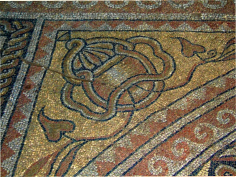 erhaltenen Teile eines riesigen Fußboden-Mosaiks sind heute im Inneren einer