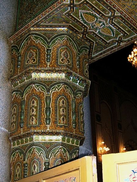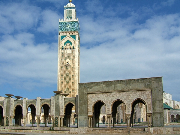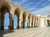 In Marokko habe ich 2005 die Stadt Casablanca im Zuge einer Dienstreise besucht. Der Name der Stadt stammt aus dem Spanischen und heißt “weißes Haus”, der arabische Name ist “Dar el Beida”. Sie ist das wichtigste Handels- und Industriezentrum Marokkos, größter Hafen Nordafrikas und mit etwa 1,2 Mio. Einwohnern die größte Stadt Marokkos. In der Region Casablanca leben etwa 3,9 Mio. Einwohner, es ist die am dichtesten besiedelte des Landes.Casablanca ist heute auch eine moderne Großstadt mit wenigen alten Bauwerken und geringen marokkanischen Kulturelementen, aber vom französischen Kolonialismus geprägt - mit breiten Boulevards und französisch inspirierten Stadthäusern aus den 30er und 40er Jahren, ergänzt durch neue Hochhäuser und viele Gebäude in neuorientali-schem Stil. Kinos, Cafés, Restaurants, Discos - alles ist hier zu finden.Sehr interessant sind auch die Basare, wo man alles kaufen kann. Am Lebensmittel-Markt gibt es lebende Hühner und Hasen, Oliven, Gewürze und Hammelfleisch, Obst und Gemüse in reicher Auswahl. Allerdings ist auch der Gestank besonders bei den ‘lebenden’ Lebensmitteln oft unerträglich.In den schmalen Gässchen werden die Waren meist so weit vor den Geschäften aufgebaut, daß man schon beinahe darüberstolpert.Markisen von beiden Straßenseiten schützen den Basar und die vielen Besucher fast vollständig vor der Sonne. Manche Leute versuchen sich etwas dazu zu verdienen, indem sie Kunden zu den Geschäften bringen. Einer lotste uns quer durch den halben Basar zu "seinem" Geschäft.Da wir nicht die Absicht hatten, irgend etwas zu kaufen, bewunderten wir die ausgestellten Teekannen, Lederpolster, Taschen, Teller, Wasserpfeifenund was es sonst noch zu sehen gab, bevor wir uns höflich bedauernd verabschiedeten. Kaum waren wir wieder draußen, wollte schon wieder jemand wissen, wonach wir suchten, er könnte uns bestimmt sagen, wo wir "das" kaufen könnten...Wir kamen auch an einer winzig kleinen Werkstätte vorbei, wo Musikinstrumente in Handarbeit hergestellt wurden. Der ganze Raum maß vielleicht drei mal drei Meter.Für die Laute auf dem Bild wollte er 1200 Dirham haben, was (im April 2005) einem Gegenwert von ungefähr 110 Euro entsprach. Mit Sicherheit hätten wir auch noch handeln können und die Tragetasche wäre auch noch inklusive gewesen.Auf dem Heimweg ging es noch einmal durch den Lebensmittelmarkt, wo auch ‘frischer’ Fisch ohne Kühlung und Schutz mitten im Weg angeboten wurde. Vorsichtshalber haben wir auch davon lieber nichts gekauft...Auch in diesen engen Gassen des Basars fahren Autos und vor allem Motorräder meist ohne viel Rück-sicht, dafür mit umso mehr Krach und Gestank.Seit dem 8. Jahrhundert war auf dem Gebiet des heutigen Casablanca die nachweisbare Siedlung Anfa lange Zeit Hauptort des Berberreichs der Berghouta. Sie wurde im 12. Jahrhundert von den Almohaden erobert. In den nachfolgenden Jahrhunderten entwickelte sie sich zu einem wichti-gen Umschlagplatz für Getreide, aber gleichzeitig auch zu einem gefürchte-ten Stützpunkt für Piraten. Im Jahre 1575 wurde die Stadt von den Portugiesen besetzt und erhielt den Namen Casa Branca. Nachdem ein schweres Erdbeben 1755 das "Weiße Haus", wie "Casa Branca" auf Portugiesisch heißt, verwüstet hatte, wurde es nur wenige Jahre später unter dem selben Namen, arabisch Dar el-Beida, vom Alouiten-Sultan Sidi Mohammed Ben Abdallah wieder aufgebaut. Er baute eine theologische Schule, öffentliche Bäder und eine Moschee, die seinen Namen trägt.Mitte des 19. Jahrhunderts schließlich ließen sich spanische Händler in der Stadt nieder und nannten sie Casablanca. Bis zum Anfang des 20. Jahrhunderterlebte die Stadt einen starken wirtschaftlichen Aufschwung und löste Tanger als wichtigsten Hafen Marokkos ab.Casablanca wurde während der Zeit des französischen Protektorats zu einem neuen Wirtschaftszentrumausgebaut.Der Film “Casablanca” mit Humphrey Bogart und Ingrid Bergmann spielt zwar in dieser Stadt, wurde aber komplett auf dem kalifornischen Studiogeländegedreht. Bis vor wenigen Jahren fand man hier nichts darüber außer einigen Postern. Mittlerweile entstand gegenüber der Altstadt ein Café - „Rick’s Café Américain“, das jetzt zwar „Bar Casablanca“ heißt, aber tatsächlich ziemlich nah an die Atmosphäre des Film-Vorbildes herankommt.Bei einem Spaziergang zu der großen Moschee kam ich auch an diesem alten Stadttor vorbei, unweit davon bot sich eine alte Verteidigungsanlage mit Kanonen als Fotomotiv an.Die imposanteste Sehenswürdigkeit Casablancas ist jedoch die moderne Große Moschee, deren Na-mensgeber der mittlerweile verstorbene König Hassan II. ist. Mit ihrem 210 Meter hohen Minarett und dem 30 Kilometer weit reichenden Laserstrahl bei Nacht ist sie weithin sichtbar und lockt Pilger und Touristen aus allen Teilen der Welt an. Nach der Moschee von Mekka kommt sie mit ihrer Größe direkt an Platz zwei. Der Bau stammt vom französischen Architekten Michel Pinseau und die Gläubigen können sich an diesem Ort geistiger Sammlung mitten in der Stadt doppelt geborgen fühlen: Erdbebensicher ist das Wahrzeichen Marokkos auch noch.Von der Welt abgeschnitten hat man sich den Gebäudekomplex aber nicht vorzustellen. So beherbergt er zum Beispiel die größte theologische Bibliothek der islamischen Hemisphäre, die auf neuestem technischen Stand und mit allen anderen Bibliotheken dieser Größenordnung elektronisch vernetzt ist. Zudem befindet sich eine Universität in dem Bau, außerdem ein Nationalmuseum und mehrere klassische Bäder (Hamams).Hier ein paar "technische Daten": 10.000 m² Mosaikböden, 67.000 m² Stuck,53.000 m² geschnitzte und bemalte Holzdecken und Holzwände wurden verlegt.Der Gebetssaal fasst bis zu 25.000 Gläubige, auf dem Vorplatz der Moschee können weitere 80.000 Menschen dem Gebet beiwohnen.Und noch etwas unterscheidet die Moschee Hassan II. von allen anderen Gebetshäusern Marokkos: Sie darf auch von Nicht-Muslime