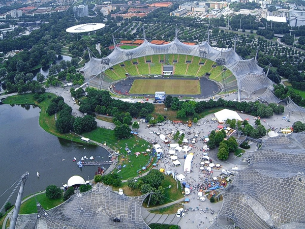Architektonsch interessant ist die Zeltdachkonstruktion des Stadions, der Schwimmhalle und der Olympia-