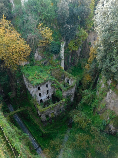Von der Brücke über die Via Fuormiura blickt man hinab in das Tal der Mühlen mit den Ruinen eines alten