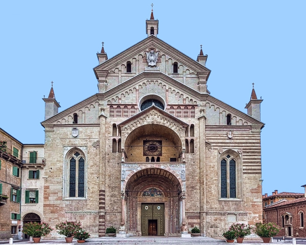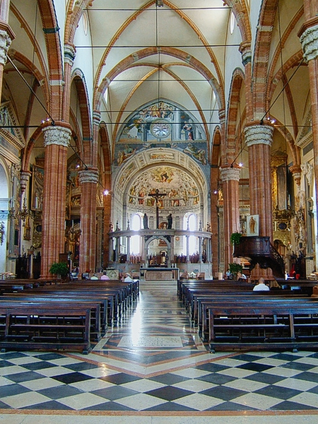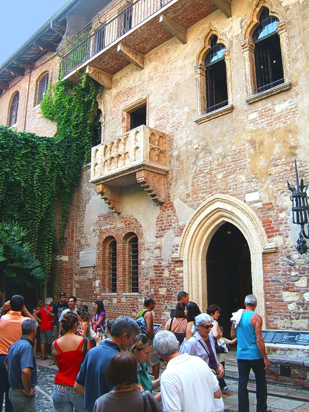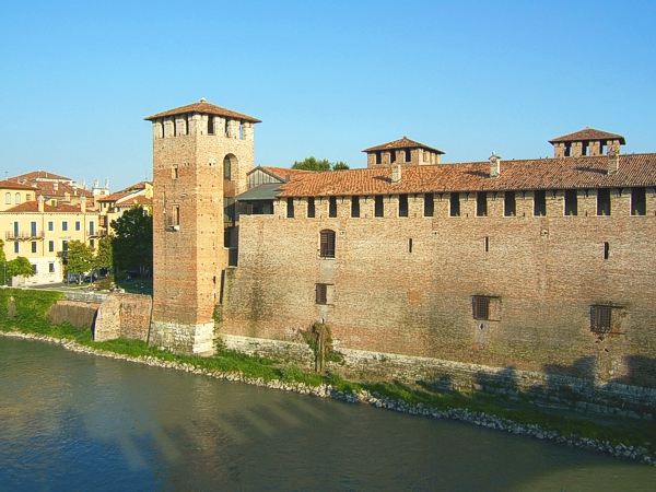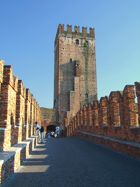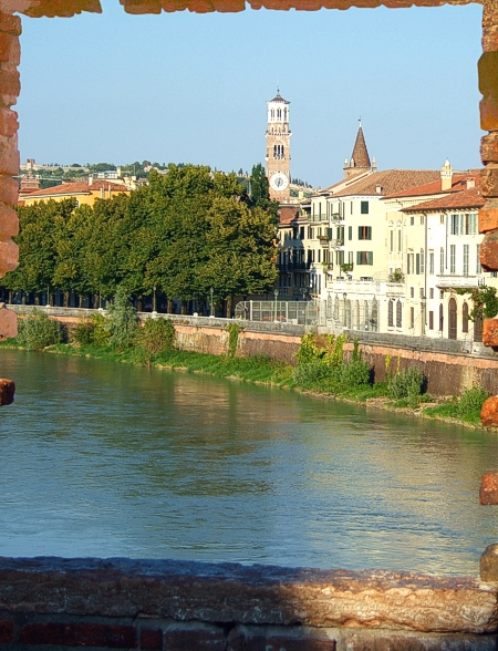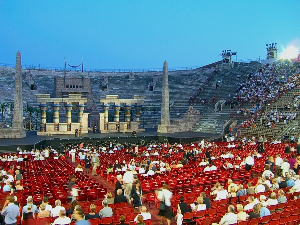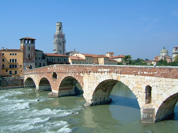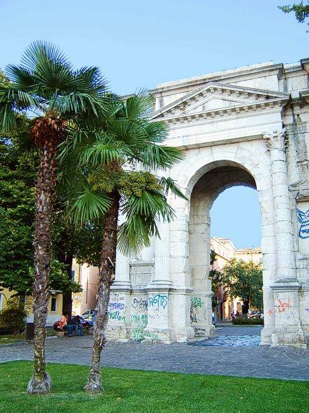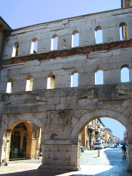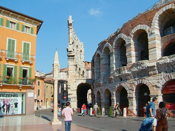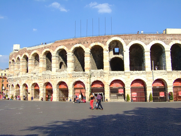Im Jahre 2008 hatte ich meiner Mutter zu ihrem 80. Geburtstag eine Reise nach Verona geschenkt, eine Opernaufführung in der Arena di Verona inklusive. Da wir uns nicht zwischen Aida und Rigoletto entschei-den konnten, buchte ich kurzerhand beide Vorstellungen.Verona liegt in Norditalien und hat ca. 256.000 Einwohner. Die Stadt wur-de in vorchristlicher Zeit gegründet, etwa um 550 v.Chr. vom gallischen Stamm der Cenomanen erobert und war ab 89 v.Chr.römische Kolonie. Historische Fassaden aus verschiedenen Epochen umgeben die Piazza delle Erbe, den Marktplatz und Versammlungsort der mittelalterlichen Stadt. Auf dem Marktplatz gibt es alles, was das Touristenherz begehrt, unter anderem sehr schöne Karnevals-masken in vielen verschiedenen Farben, Formen und Größen.In der Via Leoni auf dem Weg zum Marktplatz kann man Ausgrabungen aus der Römerzeit bewundern. Gleich daneben das ehemalige StadttorPorta dei Leoni. Ein weiteres Tor, das dreigeschossige, monumentalePorta dei Borsari öffnete sich einst für die Römer-straße Via Postumia. Es wurde 265 n.Chr. unter Kaiser Gallienus erbaut und ist nach dem bekannten Amphitheater das am besten erhaltene römische Monument.DenMarktplatz dominiert der mittelalterliche Uhrturm Torre dei Lamberti. Mit seiner Konstruktion wurde bereits 1172 begonnen, nach Blitzschlag, Brand und dem Einsturz der Turmspitze am Anfang des 15.Jh. wurde der Turm bis 1464 renoviert. Mit einem Aufzug oder über 368 Stufen kommt man zu einer Aussichtsplattform, von wo man einen schönen Blick über die Stadt hat.In dieser alten Kirche mit der barocken Fassade ist heute eine Pizzeria eingerichtet. Der Besucher findet hier immer wieder historische Sakralbauten, die teilweise als Wohn- oder Geschäftshäuser genutzt werden.Von der Piazza delle Erbe sind es nur wenige Schritte zum Haus der Julia mit dem wohl berühmtesten Balkon der Literaturgeschichte. Für die Figuren in dem Schauspiel Romeo und Julia von William Shakespeare gab es keine historischen Vorbilder und auch keinen Balkon der Julia. Angeblich sei dieser in Wirklichkeit ein alter Sarkophag und wurde von den Veronesern als touristische Attraktion hier eingebaut.Die im Jahre 1355 unter Cangrande II. erbaute Burg der Herren della Scala an der Etsch und die zinnenbekrönte Festungsbrücke sind zwei schöne architek-tonische Meisterwerke. Der Zweck des Castelvecchio und der Ponte Scaligerowar es, den Fluchtweg der Scaliger zum anderen Ufer der Etsch zu sichern.Die dreibögigePonte Scaligero war zum Zeitpunkt ihrer Fertigstellung 1356 mit einer Hauptspannweite von knapp 49m die größte Segmentbogenbrückeder Welt. Die Burg beherbergt heute ein Museum mit Wer-ken der Veroneser Malerei und Skulpturen aus dem Mittelalter. Im Hof des Castelveccio sieht man viele schöne Fassaden und Fenster.Der Dom Santa Maria Matricolare wurde 1187 geweiht und vereint so-wohl romanische als auch gotische Bestandteile. Bekannt ist vor allem das Portal von Nicolò mit seinen zeitgenössischen romanischen Steinmetzar-beiten. Im Innenraum finden sich schöne Fresken von 1500, das Altar-gemälde von Tizian und die in den Jahren 1122 - 1135 erbaute romani-sche Taufkapelle.Die Ponte Nuovo del Populo sieht gar nicht so neu aus, wie ihr Name sagt. Der Turm mit dem Gerüst im Hintergrund gehört zum Dom.Geht man von der Ponte Scaligeri in die Stadt, kommt man als erstes am Arco dei Gavi vorbei. Der römische Triumphbogen stammt aus dem 1.Jh. n.Chr. Im Jahr 1805 rissen die Franzosen das Monument ab. Die Trümmer wurden erst 1932 wiederentdeckt und nach einer Aufrisszeichnung neu zusammengefügt. Im Torbogen selbst kann man noch über eine original Römerstraße gehen. Die vielen Graffiti und das Gekritzel sind allerdings neueren Ursprungs...Am Fuße dieses mit vielen Zypressen bewachsenen Hügels S. Pietro mit dem Palazzo kann man gegen saftigen Eintritt ein recht verfallenesrömisches Theater besichtigen.Die Arena von Verona ist ein recht gut erhaltenes römisches Amphitheater und nach dem Kolosseum in Rom und der Arena von Capua das drittgrößte erhaltene Theater. Die Arena ist ca. 138m lang, ca. 110m breit und hat eine Höhe von genau 24,1m. Auf den 44 Rängen des Zuschauerraums haben heute etwa 22.000 Zuschauer Platz. Das Theater wurde etwa im Jahr 30 n.Chr. errichtet und lag damals außer-halb der römischen Stadtmauer. In dieser Zeit fasste die Arena mehr als 30.000 Zuschauer und wurde für Gladiatorenkämpfe und andere Wett-kämpfe genutzt.Nach einem Erdbeben im Jahr 1117, bei dem der größte Teil des Außenrings zerstört wurde, diente die Arena als Steinbruch für die wachsende mittelalterliche Stadt. Heute sind nur noch vier Bögen des ehemals die Arena vollständig umfassenden Außenrings erhalten. Sie werden von den Veronesern „l'ala“ – der Flügel – genannt. Dieses Foto entstand vor dem Beginn der Aufführung von VerdisAida - dem bekannten Paradestück für die Arena di Verona. Die Aufführung der Oper Rigoletto von Giuseppe Verdi hat uns jedoch besser gefallen.Trotz der monumentalen Größe des Bauwerks scheint es unter den Stufen und Rängen doch nicht aus-reichend Platz für die aufwändigen Kulissen und Requisiten zu geben. So werden diese kurzerhand an der Außenseite und auf der Piazza Bra "zwischengelagert".