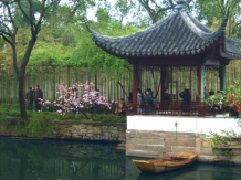 Der Tiger Hügel war auch unser erstes Ziel. Der nur 38m hohe Hügel erstreckt sich über ein Gebiet von 14.100m². Die einen wollen hier am Grab des Königs He Lu (ca. 496 v.Chr.) einen weißen Tiger gesehen haben, andere meinen, der Hügel sähe aus der Luft einem Tiger ähnlich. Die genaue Herkunft der Bezeich-nung ist nach wie vor nicht klar. Die Geschichte des Hügels reicht bis zu 2500Jahre zurück.Der "Sword Testing Rock" - im Bild rechts - erzählt die Geschichte von König He Lu, der seltene undgute Schwerter sammelte. Man sagt, er hätte diese an jenem Stein geprüft. Der Spalt in dem Felsen ist der einzige Zeuge dieser Legende, die Schwerter selbst wurden nie gefunden, es heißt, sie würden als Grabbei-gaben unter dem Sword Pool liegen. Das Grab von König He Lu wurde allerdings bis heute nicht gefunden.Die Tiger Hill Pagoda steht auf der Spitze des Hügels und ist die älteste Pagode in der Umgebung von Suzhou. Sie wurde in der Northern Song Dynastie (959 - 961) als Teil eines Tempels errichtet. Sie ist 48m hoch und hat sich in den letzen hundert Jahren immer mehr Richtung Nordwesten geneigt. Ihr höchster Punkt ist derzeit ca. 2m von seiner ursprünglichen Lage entfernt.Für rund 80.- Euro (2008) kann man sich auch mit der Sänfte auf den Hügel tragen lassen.Suzhou hat heute ungefähr 10,5 Millionen Einwohner, davon leben ca. 2,1 Mio. in der Innenstadt. Das historische Zentrum der Stadt ist von vielen Kanälen durchzogen und wird deshalb auch ‘Venedig des Ostens‘ genannt. Südlich der Stadt liegt der Taihu (der Tai-See) der drittgrößte Binnensee Chinas.Der Hanshan-Tempel liegt nicht weit vom Stadtzentrum Suzhous entfernt. Das buddhistische Kloster kann auf eine 1400 Jahre lange Geschichte zurückblicken. Die Tempelanlage erstreckt sich auf einer Gesamt-fläche von 10.000m². Der Eingang zeigt nach Westen, da Buddha für Gläubige im Westen zu suchen sei. Das ist einzigartig, denn normalerweise ist der Eingang eines Tempels nach Osten oder Süden ausgerichtet. Eine riesige Buddha-Statue thront in der Mitte der Haupthalle des Klosters.Der Name des Klosters geht angeblich auf einen Wettbewerb zwischen zwei Mönchen zurück. Der eine hieß Han-Shan und der andere Shi-De. Einer von ihnen sollte der Abt des Klosters werden. Doch beide zierten sich.Da kam eine ältere Frau, die sagte, wer über Nacht eine Brücke über den Fluss vor dem Kloster zaubern könne, der solle der zukünftige Abt sein. Der Mönch Shi-De zog seine Robe aus und versuchte, sie in eine Brücke zu verwandeln.Doch der Wind blies heftig, und die aus der Robe verwandelte Brücke drohte zusammenzubrechen. Gerade in jenem Moment warf der andere Mönch Han-Shan seinen Stock und verwandeltete ihn in einen Baum. Anschließend neigte sich der Baum und wurde zu einer Brücke über den Fluss. Das beobachte die ältere Frau und urteilte dann, Meister Han-Shan sei überlegen, er solle der Abt sein.Seitdem heißt das Kloster Han-Shan-Tempel. Und die Brücke, erzählt die Überlieferung weiter, hieß von da an Amber-Brücke, denn der Stock von HanShan soll aus Amberholz geschnitzt gewesen sein. Auch heute kann man noch die Statuen der beiden Meister sehen. Sie sehen deutlich freundlicher aus als die anderen Mönch-Statuen. Sie lächeln und strahlen große Gelas-senheit aus. Der eine hält eine Lotusblume in der Hand und der andere einen Kasten. Der Lotus und der Kasten, beides heilige Symbole im Buddhismus, symbolisieren Eintracht.Nach einer Fahrt durch die hoffnungslos verstopften Straßen Suzhous sah ich dann einen der berühmten Gärten dieser Stadt: Den ‘Garten des bescheidenen Beamten’ - The Humble Administrator's Garden.Die klassischen Gärten in China sind Paradiese für Geist und Seele, in denen man Schönheit, Erholung und inneren Frieden finden kann. In diesen Gärten werden meist Landschaften nachgebildet, in denen die Natur und die Kultur des Landeskunstvoll und vollkommen zu malerischen Bildernverschmelzen. Im Streben nach Harmonie entstanden so diese architektonischen Meisterwerke, welche die Bedeutung der Schönheit der Natur in der chinesischen Kultur sehr gut widerspiegeln. Die Gärten wurden vom 11. bis zum 19. Jh. von kaiserlichen Beamten oder reichen Kaufleuten angelegt. Dieser Garten ist mit 52000m² der größte und ist im Welt-Kulturerbe ge-listet. Er wurde um 1509, zur Zeit der Ming-Dynastie (1368- 1644) von einem Beamten namens Wang Xianchen angelegt. Man sagt, er selbst sei trotz seiner vielen Verdienste nie gewürdigt worden und hätte deswegen seinem Garten diesen Namen gegeben. Der weitläufige Gartendes bescheidenen Beamten hat einen östlichen, einen mittleren und westlichenGarten. Das Hauptgebäude des östlichen Gartens ist die ‘Cymbidium Goeingii Hall’ (Lanxiang Tang). Der ‘Celestial Spring Pavilion’ (Tianquan Ting) hat seinen Namen von einer alten Quelle in seinem Inneren, deren Wasser sehr süß schmeckt.The ‘Hall of Distant Fragrance’ (Yuanxiang Tang) ist das wichtigste Gebäude im mittleren Garten. Der intensive Duft der vielen Lotosblüten ist zum Sommeranfang hier besonders gut zu genießen. Im westlichen Garten findet man auch einen sehr schönen Bonsai-Garten.